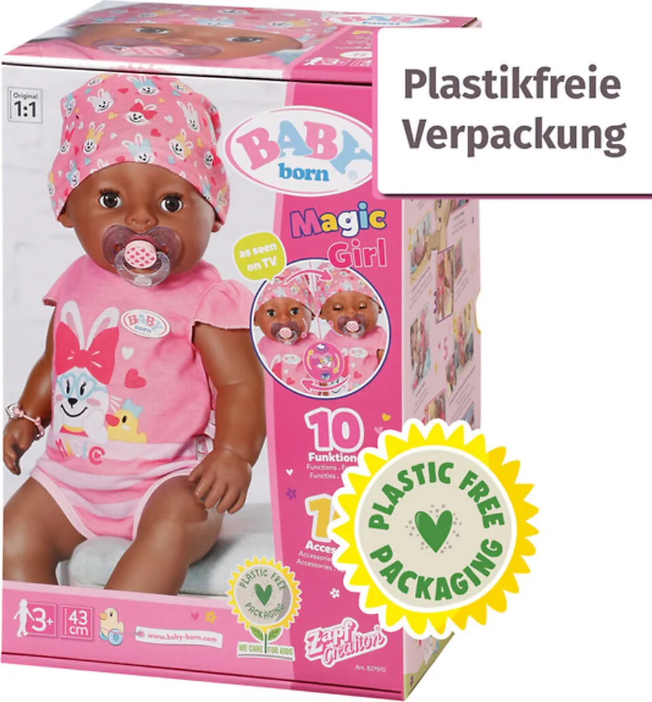 Die Gute-Nacht-Geschichte ist echt spannend, aber das Girl ist so müde. Ihm fallen beim Vorlesen immer wieder die Augen zu. Aber das Mädchen hat jetzt einen Trick: einfach den Schnuller im Mund drehen und schon bleiben die Augen offen. Wenn das im echten Leben auch so einfach ginge Durch Drehen des Schnullers öffnet und schließt die Puppe die Augen. Egal in welcher Position sich ihr Körper befindet. Darüber hinaus hat das Girl Schlafaugen. Legt man sie ohne Schnuller auf den Rücken, schließt sie die Augen automatisch. Schlafen, Baden und Essen sind des Girls Lieblingsbeschäftigungen. Sie trinkt gerne Wasser aus ihrem Fläschchen und kann dann Pipi in die Windel oder ins Töpfchen machen und echte Puppentränen weinen. Neben Wasser steht der BABY born Brei auf dem Speiseplan. Dann macht sie sogar ihr großes Geschäft. Ihre Arme, Beine und der Kopf sind super beweglich, so dass das An- und Ausziehen der stylischen Kleidung zum Kinderspiel wird. Der Soft Touch Körper ist angenehm weich. 10 Accessoires, die ihre Funktionen unterstützen, ein pinker Body und ein Mützchen gehören zur Erstausstattung. BABY born Magic Mit 10 lebensechten Funktionen für große Spielfreude. Das abwechslungsreiche (Rollen-)Spiel mit BABY born fördert die Fantasie und unterstützt nachweislich die Entwicklung sozialer Fähigkeiten und Werte wie Verantwortung, Kommunikation und Einfühlungsvermögen. Der Schnuller passt jeder BABY born Puppe in 43cm. Die Augen-Funktion des Schnullers geht nur in Verbindung mit BABY born Magic. Benötigt keine Batterien. BABY born Magic Girl 43cm mit Body und Mütze. Inklusive 1 Töpfchen, 1 Windel, 1 Teller mit Löffel, 1 Portion Brei, 1 Flasche, 1 magischer Schnuller, 1 Geburtspass und je 1 Freundschaftsbändchen für Kind und Puppe.