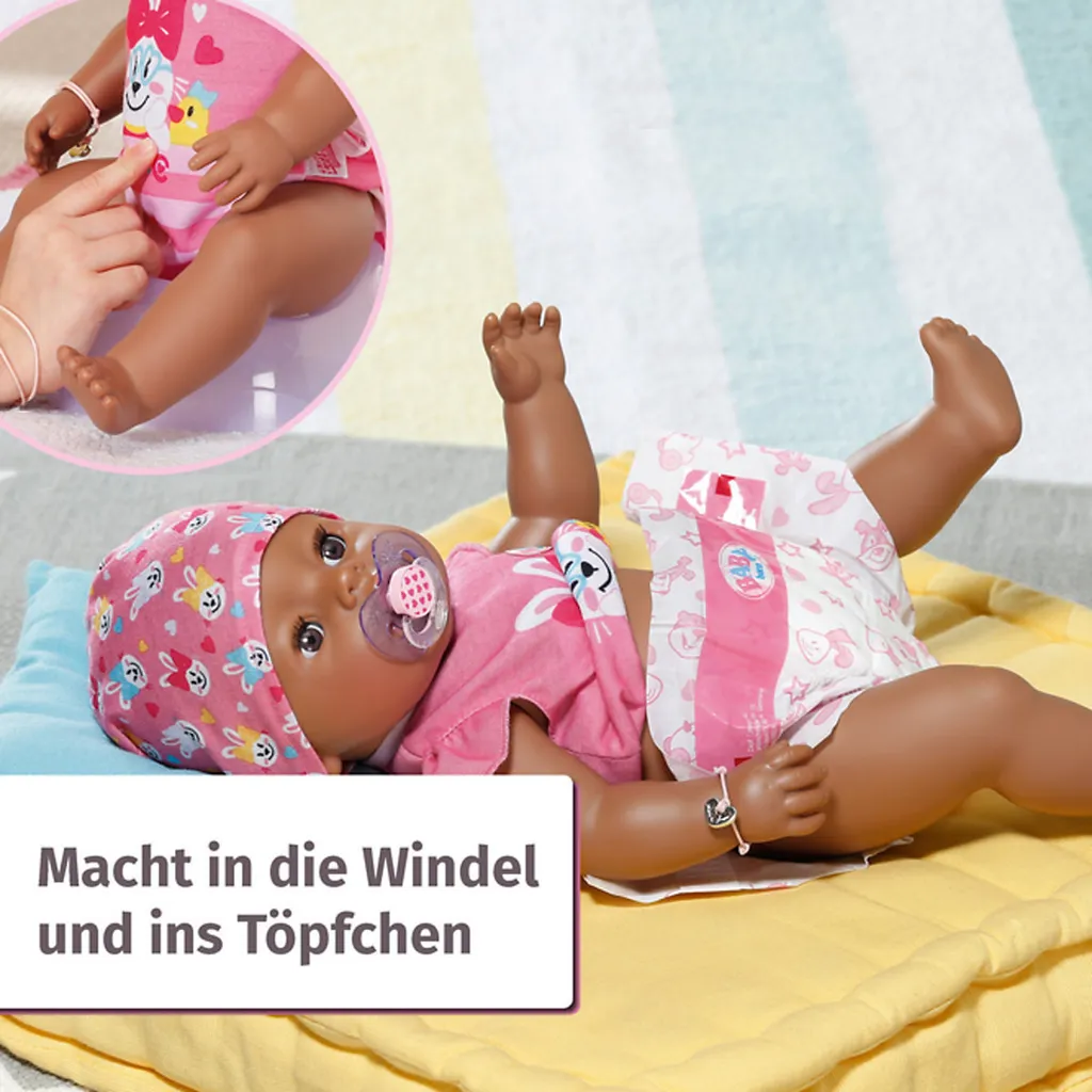 BABY born Soft Touch Magic Girl Brown Eyes mit 10 lebensechten Funktionen, die alle ohne Batterien funktionieren. NEU: Sie öffnet und schließt ihre Augen magisch. BABY born Soft Touch Magic Girl Brown Eyes bietet ein realistisches Eltern-Kind-Rollenspiel.