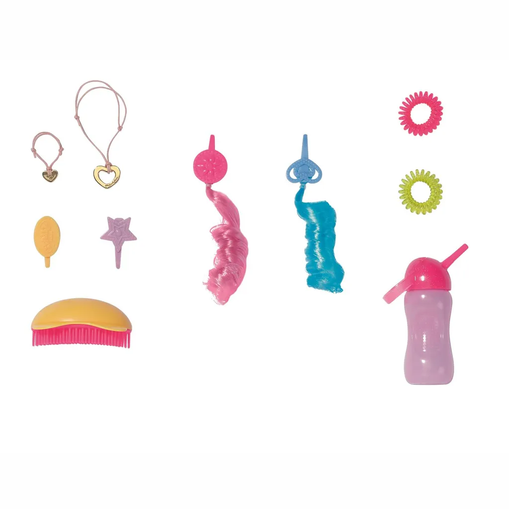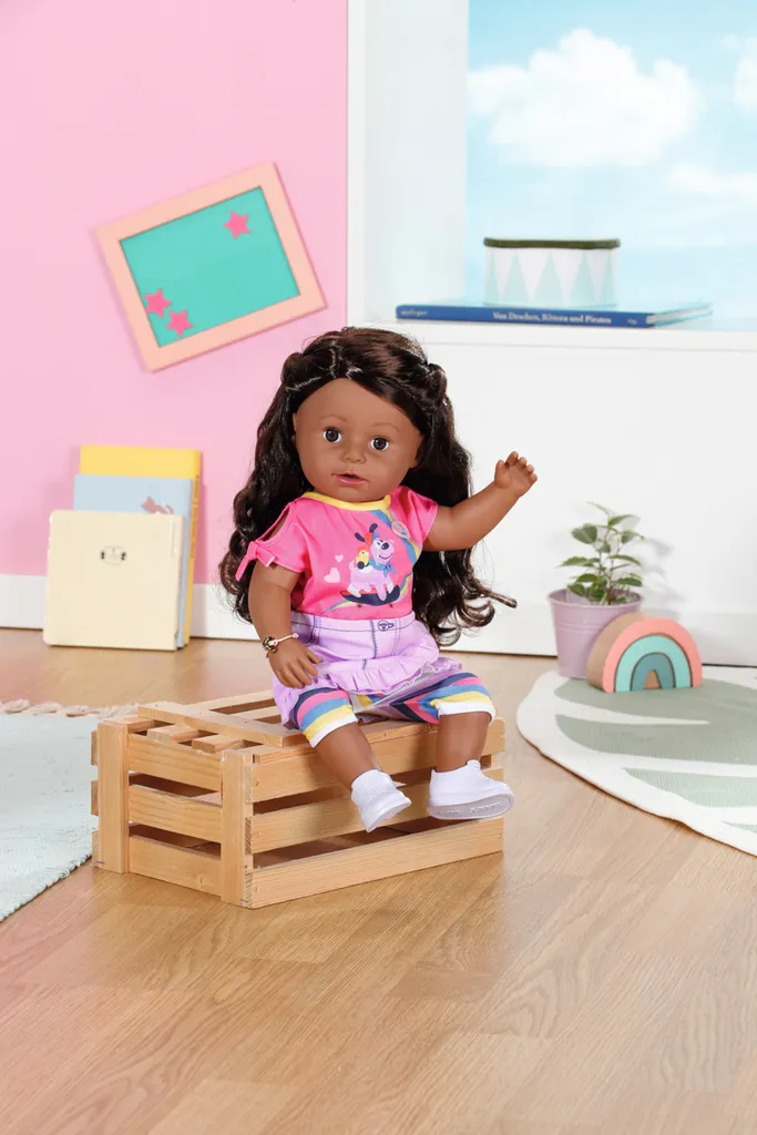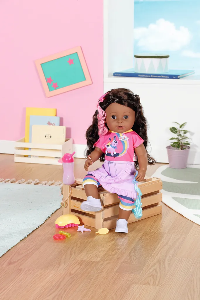 BABY born ist ganz fasziniert von den Locken ihrer Schwester und will immer mit ihr Friseur spielen. Voller Aufregung zwängt sie sich an verschiedenen Stellen die bunten Extensions ins Haar. Die rosa und türkisfarbenen Extensions passen gut zu den dunklen Haaren. Die Mädchenpuppe sitzt geduldig, wenn sie mit dem Pinsel gestylt wird und die Zöpfe mit Haarbändern und Haarspangen verziert sind. Wenn ihr während des Haarschnitts ein Gerücht in den Haaren auftritt, kann sie sich manchmal eine Puppenträne über die Wange tropfen lassen. Aber auch nur, wenn sie Wasser aus der Flasche zu trinken bekommt. Durch ihre beweglichen Knie kann sie nicht nur bequem sitzen, sondern auch ganz alleine stehen. Aber warum stehen und sitzen, wenn man sich in der BABY born Badewanne auch hinlegen und entspannen kann? Die Schwester hat ein Kleid mit pinkfarbenem Oberteil mit speziellem Knoten an der Schulter und einem lila Rock im asymmetrischen Design. Die gestreifte Leggings fängt die Farben des Regenbogens auf der Bluse ein. Ihre Sportschuhe sind in dezentem Weiß gehalten. BABY born Schwester mit sechs lebendigen Funktionen, inspiriert zu abwechslungsreichen Rollenspielen und Spielen, fördert die Fantasie und unterstützt die Entwicklung sozialer Fähigkeiten und Werte. Ab 4 Jahren. Inhalt: – BABY born Sister 43 cm mit Kleid, Leggings und Schuhen – Fläschchen, Haarbürste, 2 Spiralgummibänder, 2 Haarspangen, 2 Clips mit Haarverlängerungen und Freundesarmband für Kinder und Puppe