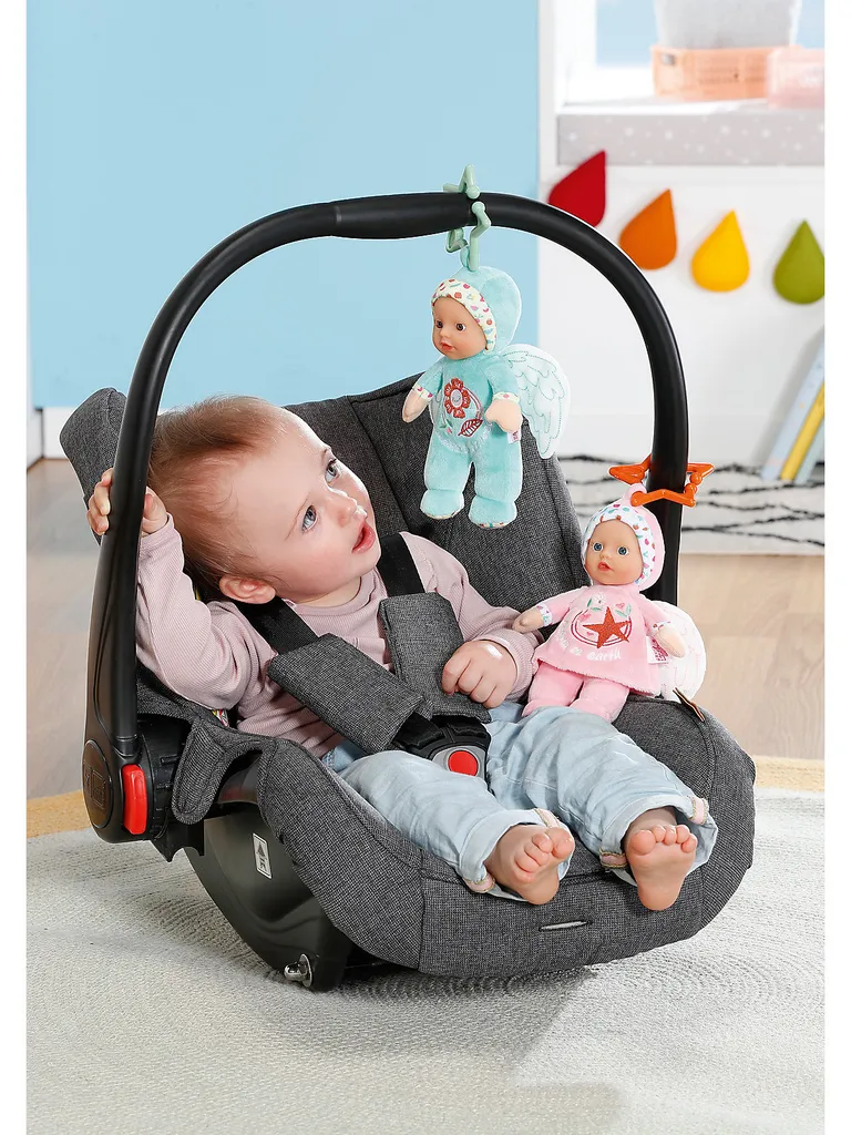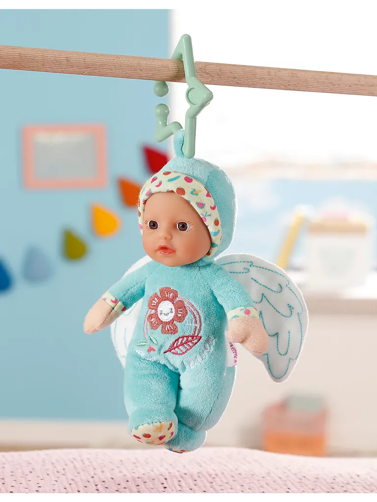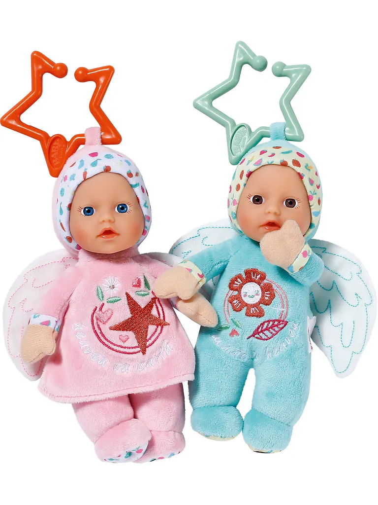 Kuschelig weich und bezaubernd niedlich! Die kleinen BABY born® Engel for babies von Zapf Creation sind aus einem anschmiegsamen Obermaterial gefertigt und begeistern schon die Kleinsten mit ihrem lieben Gesicht und dem hübschen Vinyl-Köpfchen. Die kleinen Engelchen haben Flügel und eine kleine Stoff-Öse mit abnehmbarem Stern als Aufhänger am Kopf. Und was passiert, wenn man das bezaubernde Püppchen schüttelt? Im Inneren versteckt sich eine Rassel! Mit den Engeln können die Kleinsten auf Entdeckungsreise gehen: Kuscheln, Spielen, Fühlen und Hören. Mit dem Stern können die Puppen unterwegs, oder zuhause an der Babyschale, dem Buggy oder dem Bettchen befestigt werden. Details:- BABY born® Engel for babies von Zapf Creation – eine von zwei möglichen zauberhaften Baby-Puppen- Stoff-Engelchen mit Vinyl-Kopf und Sternchen-Aufhänger- im Inneren mit einer Rassel ausgestattet- zum Kuscheln, Spielen und EntdeckenMaße: ca. 18 cm (Höhe)Material: Kunststoff, TextilHinweis:Der Artikel wird in einer zufälligen Farbvariante geliefert. Eine Vorauswahl ist nicht möglich.